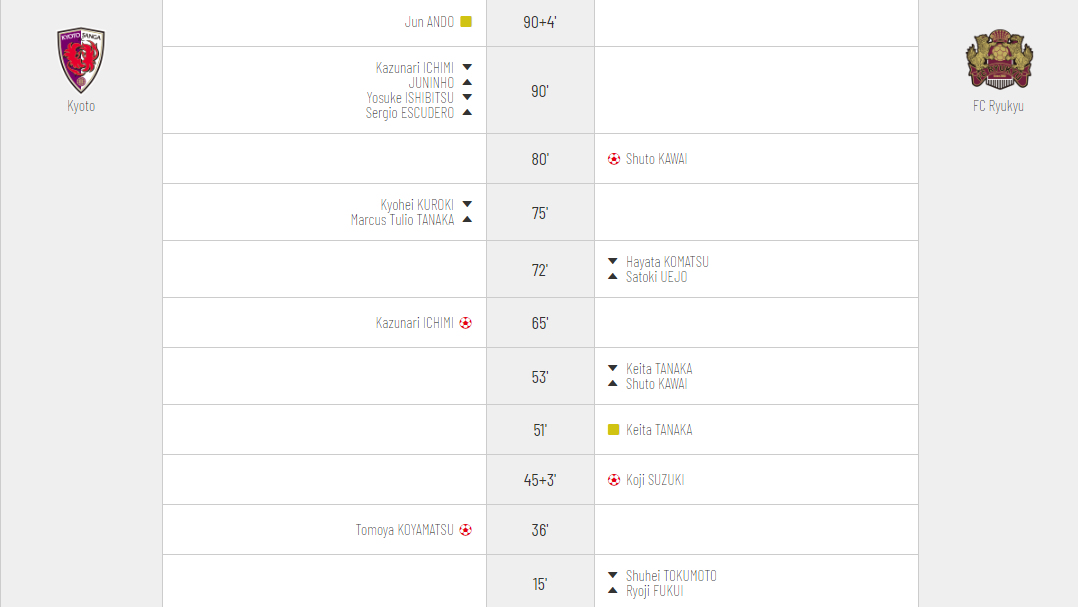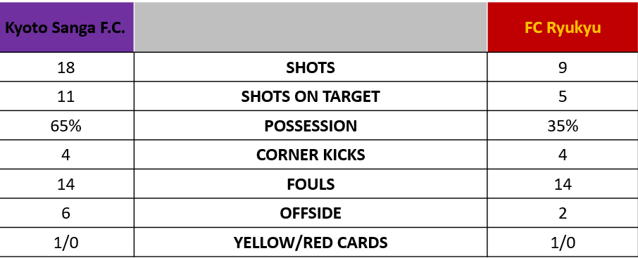 Well FC Ryukyu earned their first positive result in a road match since the late equalizer by Uesato back in match day 9 against Tokyo Verdy. This means that Ryukyu broke a 4-game losing streak on the road and it also meant that Kyoto will remain winless in games started after 1800. FC Ryukyu return home next week to face a very strong, recently defeated, 4th placed Ventforet Kofu side.