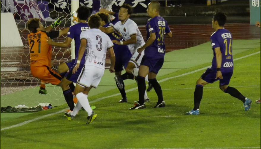Ryukyu started the second half slowly after already conceding 68% of the possession to Kyoto in the first half. Right away in the 46th minute, Kyoto were awarded the FK after Masutani fell to the ground from an attempted clearance. Now, Masutani was able to make the clearance, but the resulting fall took him into the path of the Kyoto player who was adjusting his run for the deflection. The Kyoto player ran into Masutani, and actually gave him a nasty knock to the head, and the ref awarded the FK. To be honest, Masutani had no idea where the Kyoto player was, didn’t stick out an arm or attempt to interfere the player, it was just the natural progression of the fall/slide that took him into the Kyoto players path. Yet the referee’s vantage point was from behind and he couldn’t see all this play out and deemed it to be an infraction and award a free kick.