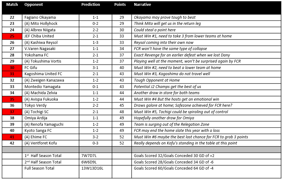 At the end of the day, FC Ryukyu need to go out there and handle their business without concerning themselves too much about the rest of the table. It is simple math for FCR: Beat the teams below you in the table especially those at the bottom, Get points off of teams just above you in the table, and win some games on the road. If they can do that, then they are going to be alright. I’d estimate that another 18 points are needed and FCR could achieve that any number of ways in the second half of the season.