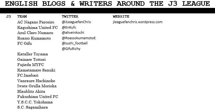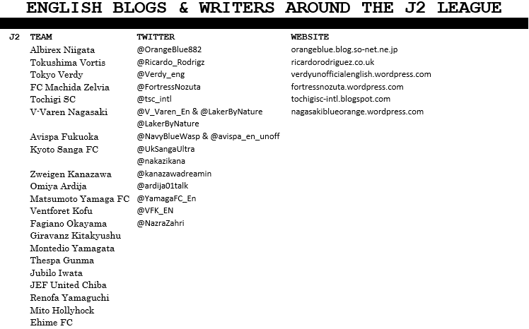 There are 4 tables below, each containing the Twitter accounts and/or websites used to broadcast the J League in English to the rest of the world. We will first start with the J2 as that is the league where FC Ryukyu currently resides followed by the J1, J3 and then the important authors, websites, bloggers and pundits who cover the J League.