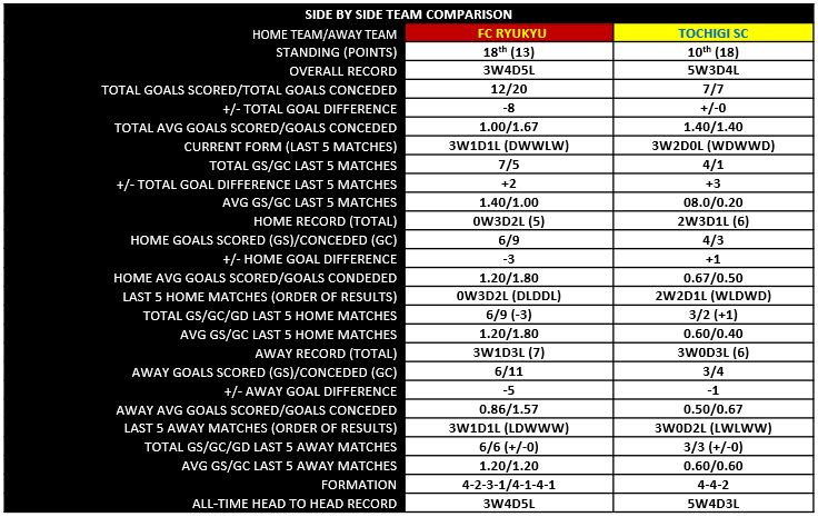 1. Do not over commit in the attack. Likelihood 3. FC Ryukyu are struggling to produce many goals these days and Tochigi are an excellent defensive side that can hit you on the counter with speed. How else can you explain their low goals scored, conceded, and possession rates and yet they still sit 8 points clear of Ryukyu. Since there is probably some growing frustration with our attack, coupled with some tired legs, there is a chance we throw everything at Tochigi tomorrow. If we make that mistake, we have seen Tochigi punish teams on the breakout.