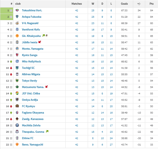 Both Giravanz and Tochigi lost so there was no upward movement for these clubs on the last day. Avispa achieved the moral victory be defeating the champs at home, but all the glory goes to Tokushima Vortis.