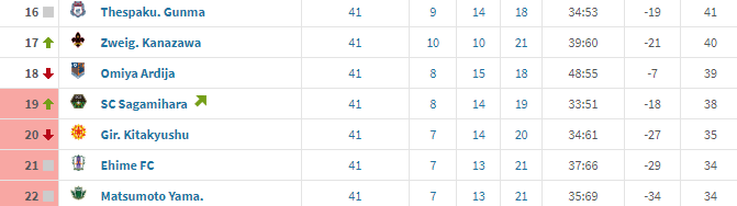 Ideally Sagamihara would need Gunma to win/draw, and Zweigen to do the same based on goal differential. But they also need to win on Sunday. However, they also have a small chance to escape relegation if Tegevajaro Miyazaki remain inside the top two promotion spots of J3. Miyazaki do not own a J2 license and therefore are not eligible for promotion. SC Sagamihara’s fate is in their own hands. Win and likely in. Lose and hope either Roasso Kumamoto or Iwate Grulla Morioka fail in their promotion bid.