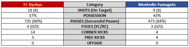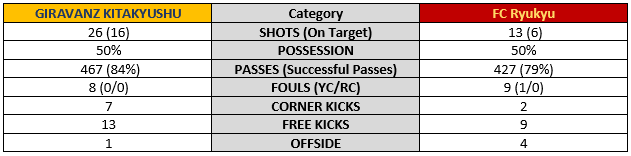 1. Work harder than Kitakyushu. Likelihood 4. It certainly didn’t start out like that as Giravanz was in complete control of the first half after only 5-minutes. They held Ryukyu to just 2 shots (1 on target) and things were looking grim for Ryukyu fans. But Ryukyu turned things around in the second half and looked the better side the remainder of the match.