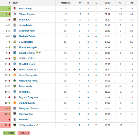 Kyoto Sanga was able to escape their game against FC Machida Zelvia with a 2-1 win, but both Jubilo Iwata and Albirex Niigata surrendered extra time goals and ended up with draws. Niigata’s was particularly brutal as they took the lead in the 94′ minute only to concede sixty second later. Kitakyushu’s loss to Ryukyu drops them from 19th to 21st as the other bottom five sides all drew on Monday night. The Zweigen Kanazawa versus V-Varen Nagasaki match was called off due to inclement weather and I don’t have a date for when it will be rescheduled.
