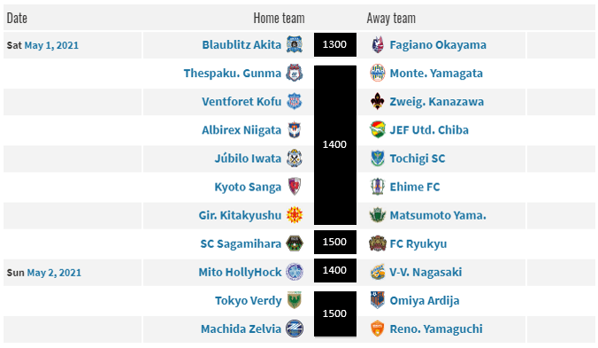 Leaders (1) Albirex Niigata get (13) JEF United Chiba this week with (3) Kyoto Sanga FC facing (19) Ehime FC. (4) Jubilo Iwata will hope a Kyoto stumble in their match so it can help them close the points gap when they play (10) Tochigi SC at home this week. The marquee matchup this round is (7) Ventforet Kofu hosting (6) Zweigen Kanazawa who both dropped points last week. (5) FC Machida Zelvia host (20) Renofa Yamaguchi FC and could turn this into a 5 team race for promotion depending on the outcome of the Kofu v Zweigen match. Finally, (8) Blaublitz Akita will try and take advantage of (12) Fagiano Okayama who are coming a rough month of April.