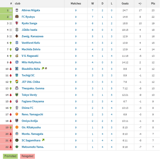 Albirex Niigata: It took 14 rounds before Niigata suffered their first loss of the campaign, but only 1 more to lose their second. Niigata started out very strong this year winning the opening 5 games followed by winning 5 out of their next 7. But Niigata has fallen off a bit starting with the draw at home to Matsumoto Yamaga F.C. and then the above mentioned losses in consecutive weeks to FC Machida Zelvia and Kyoto Sanga FC. For the year, Albirex have taken zero points off of any of the teams currently inside the top six, though they have yet to face Ventforet Kofu or Jubilo Iwata, whereas FC Ryukyu have taken 7 points in their 3 matches against these teams.