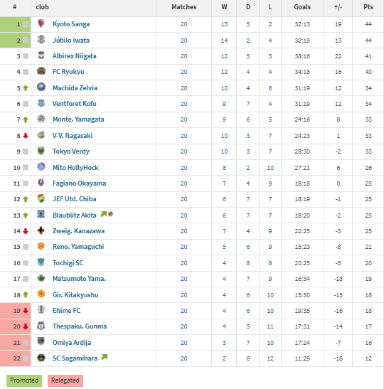 Kyoto and Iwata both won to extend their lead over Niigata and Ryukyu to 3/4 points. Niigata’s 0-0 draw means Ryukyu are now within 1-point of Niigata. Zelvia and Kofu’s huge wins mean they both maintain their 4-point gap between themselves and FC Ryukyu. Omiya Ardija’s first win in over three months means they are at least within striking distance of pulling out of the relegation zone.