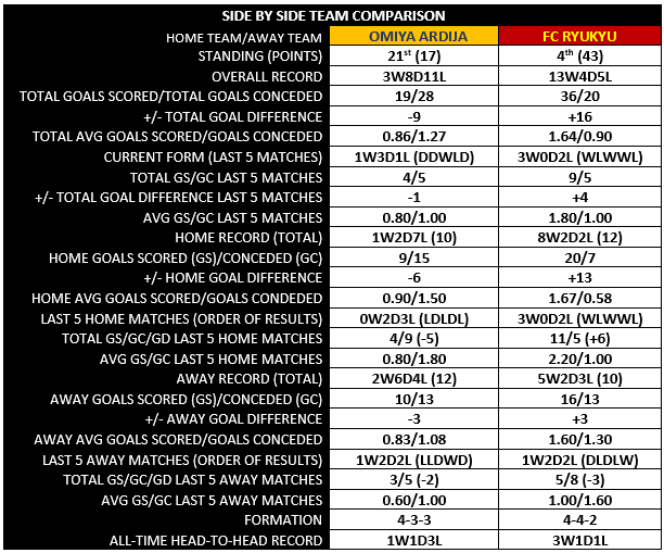 FC Ryukyu: We know Omiya’s track record against the top four sides in J2 isn’t that great, well, FC Ryukyu’s record against the bottom four isn’t something to boast about either. In the five games this season against the bottom four clubs, FC Ryukyu have managed 8 points out of a possible 15 with 2 wins, 2 draws and the lone loss occurring last week at home to SC Sagamihara. Oh, where would Ryukyu be with even some of those dropped points?