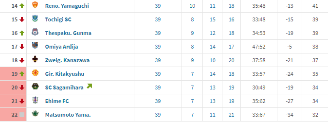 We all know that the real excitement in any season is watching how the relegation battle plays out, bit of recency bias down here these days for sure, and not just the boring promotion race (though I do miss that dearly) where a couple of teams pull far away from the pack. The sheer look of disappointment and frustration written across many teams, coaches and their fan’s faces make the battle for survival all the better. However, I should mention that there is a very nice top of the table tilt between (3) Albirex Niigata and (2) Yokohama FC this week that could see those teams swap positions or YFC extend their lead to six (6) points in the automatic promotion zone.