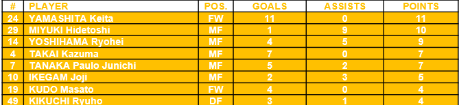 Koki Kazama: Koki missed roughly ¼ of the season due to injury but came back strong to finish the campaign. He pairs nicely with Uesato in the middle and it would be devastating to lose both of these players this offseason. Koki is not asked to score many goals, in fact, neither of the central midfielders are asked to do that. They are there to support the attack and cover the central defenders. However, Koki does take a fair number of free kicks, and he is quite good from the dead ball spot. If Koki departs, along with Uesato and Yu this offseason, Ryukyu will be hard pressed for free kick takers.