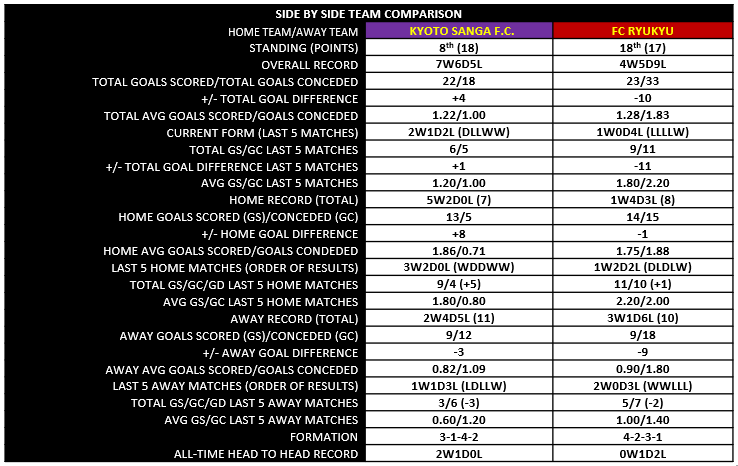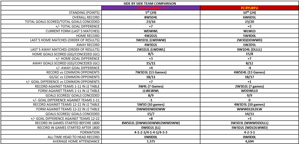 FC Ryukyu. That nice run of form FC Ryukyu experienced between the end of July and August has but been forgotten as Ryukyu have lost 5 out of their last 6 and while being outscored 9 to 12 during that span. The 5-0 drubbing of Omiya stands out as an anomaly between the defeats to Yamagata and Zelvia, which are only compounded by the 1 goal losses to Niigata, Kanazawa, and most recently Kyoto Sanga.