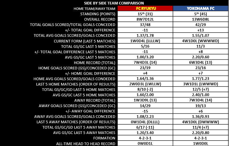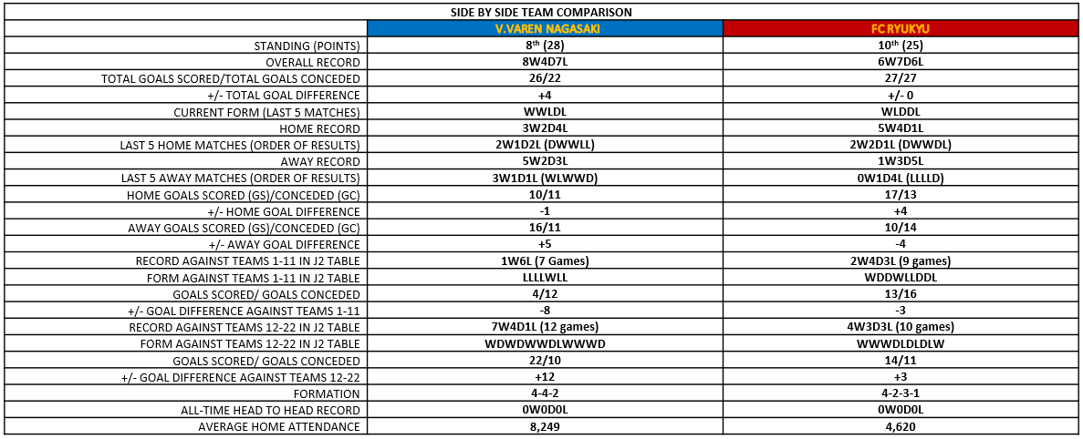 Ryukyu hold a slight advantage when looking at each sides’ record against opponents in the top half of the table with Ryukyu scoring more goals against that level of competition compared to Nagasaki. This will also be Nagasaki’s 4th match in 10 days and hopefully there are some tired legs on the Nagasaki squad that Ryukyu can exploit though most of the expected starters for Nagasaki were rested during their mid-week Levain Cup match. Hopefully this will be an enjoyable match to watch and I’d love to see Ryukyu score more than 2 goals.