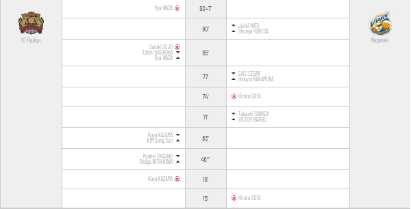 FC Ryukyu were able to score two very nice goals near the end. One from Koji Suzuki and another from Uejo, our 2 leading goal scorers on the year but the early 3-0 lead proved too much to overcome for Ryukyu. Final Score Nagasaki 3-2 over Ryukyu.