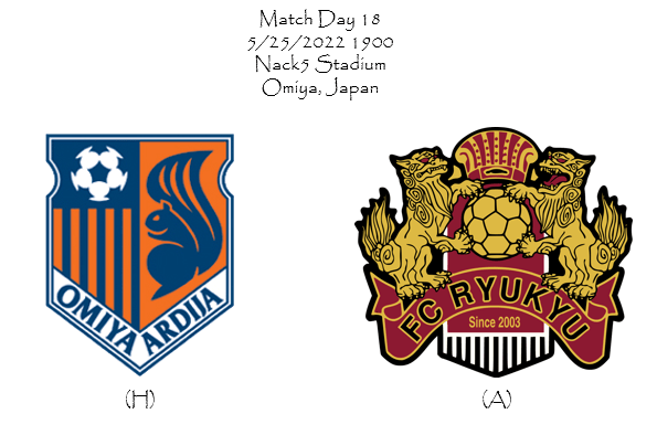 Omiya Ardija: Omiya have been inside the relegation zone around the same amount of time as Ryukyu. They didn’t earn their first win of 2022 until Match Day 9, then experienced a bit of bump in performance when they went four (4) games undefeated (2 wins and 2 draws), before losing two (2) games in a row. Omiya has also been hit hard by the injury bug this year as they’ve lost both of their top two goalies in Yuta Minami (Achilles Tendon Rupture) and Tomoki Ueda (Patellar Tendon Rupture) for the season, and most recently FWD Seiya Nakano (hamstring). This has thrust Ko Shimura, on loan from Giravanz Kitakyushu, into the starting role where he has already conceded five (5) goals in two games.