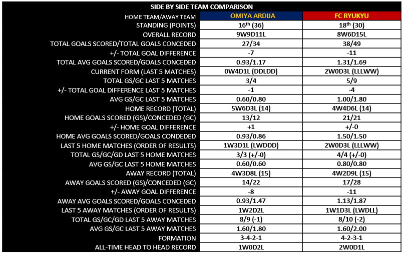 FC Ryukyu have won three of the four games they’ve played against Omiya. Last year FC Ryukyu completely blanked Omiya to the tune of 8 goals scored, 0 conceded in their two games. Ryukyu have scored multiple goals against Omiya every time with the lowest score line of any of these matches being just 3 total goals scored on match day 30 last year.
