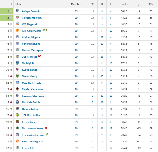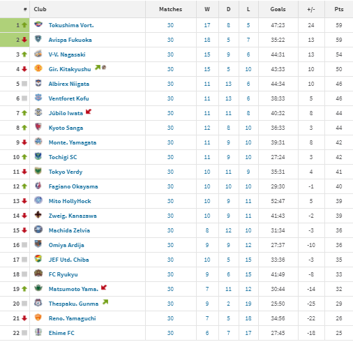 Fukuoka wobbled, allowing Tokushima Vortis to assume the lead this week though they needed a late goal to earn all 3 points over Gunma. V-Varen Nagasaki is hot on the heels of the leaders and if Fukuoka stumbles again, it could open the door for Nagasaki who are have the same goal differential.