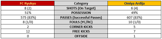 3. Buses were parked and neither team could break through the others defense. It was evident that Ryukyu were searching for that last pass to unlock the Omiya defense but it never materialized and attacks died on the spot. Coming into the match Omiya had given up four goals to what Sporteria calls a spilled ball but only one goal from a cross. Ryukyu simply didn’t put enough shots on target that could have led to rebounds or these types of spilled balls.