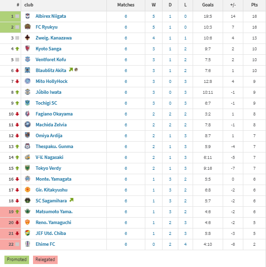 There were 3 questions I asked heading into this round. 1.) Can Ryukyu hold serve with Niigata? Well they did thanks in large part to the heroic efforts of SC Sagamihara at home on Sunday to Niigata. 2.) Can Nagasaki rebound after a loss? Yes, they defeated Kofu on a Ryo Shinzato late goal. 3.) Can Akita continue their hot start? Unfortunately no as Matsumoto Yamaga FC scored multiple goals for the first time which is probably attributed to Akita missing one of their better defenders this game.