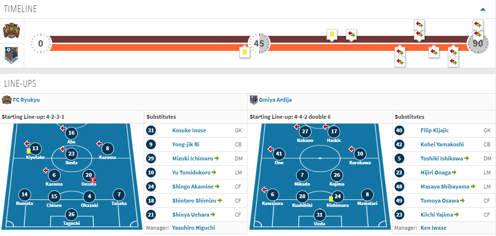 1. A tale of two halves. FC Ryukyu looked the better side to open the game but Omiya looked the far more dangerous team in the second half. Ryukyu out shot Omiya 6-1 in the first half but Omiya turned that around to a 5-2 advantage to close out the game. Granted, few if any of these shots troubled either keeper this weekend and Ryukyu failed to register even one shot on goal in the second half.