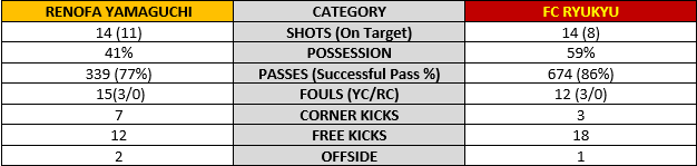 1. A tale of two halves. FC Ryukyu were the better side in the first half as they walked into halftime with a 2-0 lead. Renofa, were far better in the second half and were rewarded with the lone goal. Ryukyu couldn’t find the finishing touch in the later stages of the game, something that also occurred last week, but were able to hang on for the win. The game itself ended in a near 50/50 split as far as possession, chances created, and shots.