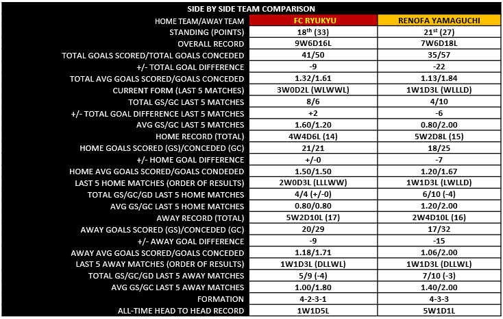 Get your drinks chilled and your snacks ready because this should be an exciting, fast paced, goal scoring match this Sunday. FC Ryukyu and Renofa Yamaguchi FC represent 2 of the 3 teams that have conceded at least 50 goals this season and in the previous 7 times these teams have faced each other since 2015, there have been 29 goals scored. In fact, there is only 1 match in which there was less than 3 total goals.