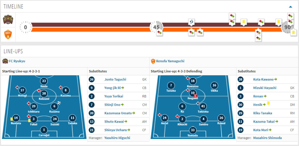 1. Numerous changes to the starting 11 resulted in very little offense for FC Ryukyu. While Ryukyu registered 8 shots on net, few of them actually troubled the Renofa goalie. For this game, Ryukyu started Ren Ikeda up top with Uehara on the bench, and Abe being left off the roster altogether.