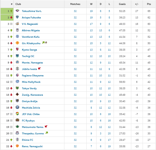 Renofa Yamaguchi FC: Renofa have been hanging around the bottom of the table since Match Day 7 when they lost to Kitakyushu on the road 0-2. The best stretch of games this team experienced was between matches 20 and 24 when they went 3-1-1 with wins over Tokyo Verdy, JEF UTD Chiba, and Jubilo Iwata while drawing against Ehime FC. That stretch represents 1/3 of the total points accumulated this season for Renofa.