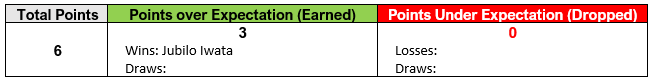 I spoke last week about wanting to track Ryukyu’s point total this year based on what I am calling “Points Over Expectation.” It is a completely subjective scaling system where I separate teams into two categories: Those that FC Ryukyu should beat, and those that they should not. The criteria includes, records against the opponent from the past two seasons, implied strength of the opponent (current position in the table and squad members) with home and away splits loosely factored in. The chart below will be included in each weekly Match Report for FC Ryukyu and has 3 categories.