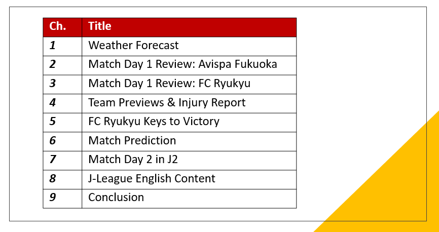 3. Limit Yamagata’s set pieces in dangerous areas. Likelihood 3. Yes, as Yamagata had 4 FKs and 4 CKs, but Ryukyu’s Achilles heel this year has been defending set pieces as both Yamagata goals came from set pieces.
